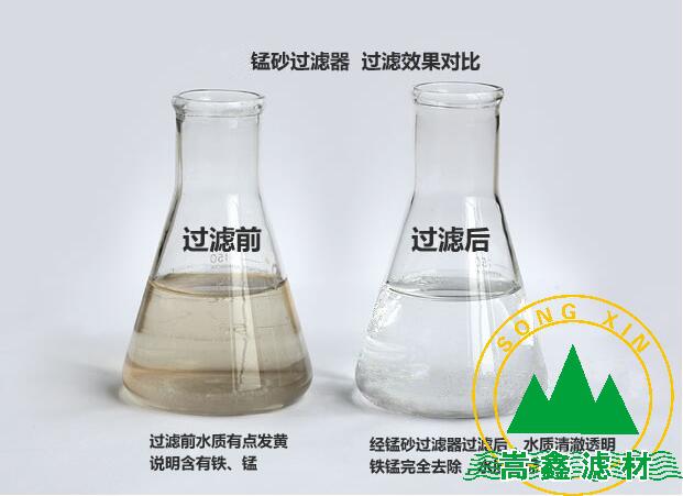 天然錳砂濾料是一種良好的天然氧化劑,它能有效的將水中二氧化錳能氧化水中二價鐵為三價鐵使其沉淀除去,二氧化錳被水中的溶解氧氧化成七價錳的氧化物。用于地下水除鐵和除錳的天然錳砂濾料,其錳的形態(tài)應(yīng)以氧化錳為主。含錳量(以MnO2計,下同)不應(yīng)小于35%的天然錳砂濾料,既可用于地下水除鐵,又可用于地下水除錳;含錳量為20%~30%的天然錳砂濾料,只宜用于地下水除鐵;含錳量小于20%的錳礦砂則不宜采用。宜優(yōu)先采用經(jīng)過科學(xué)試驗(yàn)或生產(chǎn)使用證明能獲得良好除鐵和除錳效果的天然錳砂品種作濾料。