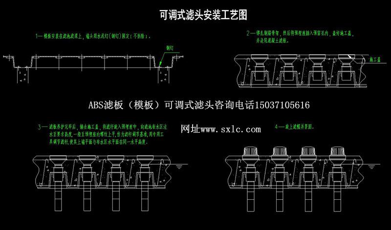 水廠濾池氣水反沖洗濾池常用的濾板有預制濾板和現(xiàn)澆整體濾板兩種:濾頭分為固定式和可調(diào)式兩種.固定式適應于預制濾板:可調(diào)式長柄濾頭特別適應于現(xiàn)澆濾板.也適應于預制濾板.QSK-ll型可調(diào)式長柄濾頭原料采用高強度ABS顆粒樹脂(簡稱ABS工程塑料)經(jīng)高溫熱溶由精密磨具成型。可調(diào)式濾頭主要用:濾帽、濾桿、預埋座組成,濾桿上設(shè)有調(diào)節(jié)螺紋,可供上下調(diào)節(jié);且設(shè)有調(diào)節(jié)瓣與預埋座內(nèi)調(diào)節(jié)瓣防脫條結(jié)合,可控制濾桿調(diào)節(jié)精度,同時固定其位置。